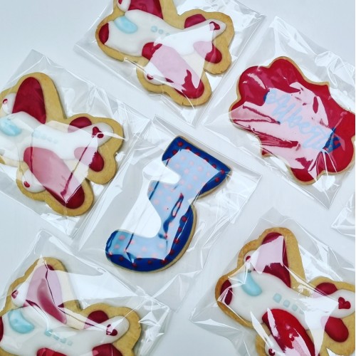 Galletas hechas a base de mantequilla decorada con Royal Icing de alta calidad, en bolsita para regalar o para decorar en la mesa dulce del candy bar de la fiesta. También las elaboramos con la receta de galletas de mantequilla sin gluten para celíacos y tenemos opciones donde no se utiliza huevo en la elaboración,  por lo que podemos hacerlas adecuadas para personas alérgicas al huevo.