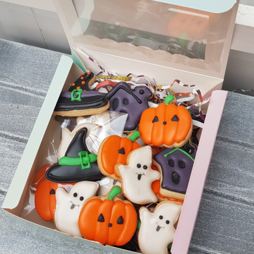 Galletas hechas a base de mantequilla decorada con Royal Icing de alta calidad, en caja temática regalar como dulces de truco o trato de Halloween o para decorar en la mesa dulce del candy bar de la fiesta. También las elaboramos con la receta de galletas de mantequilla sin gluten para celíacos y tenemos opciones donde no se utiliza huevo en la elaboración,  por lo que podemos hacerlas adecuadas para personas alérgicas al huevo.