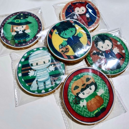 Galletas surtidas de temática infantil Halloween. Hecha a base de mantequilla y glasa real de alta calidad y decorada con papel comestible. Son riquísimas y a los niños les encantan en sus fiestas infantiles de Truco o Trato