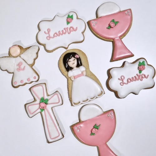 Galleta variadas personalizadas con el nombre de la niña que realiza su Primera Comunión. Decoradas para entregar a los invitados como detalles de la Comunión o para incorporar y decorar el Candy Bar o mesas dulces de la celebración. También con receta sin gluten o sin huevo, para celíacos y alérgicos.